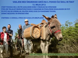 Skozi te »gase« je vodil tudi del poti na 3. Pohodu Čez Školj in Tibot, ki smo ga kot osrednji del praznika Med šmarenskimi griči pripravili na nedeljo, 20. maja. Na štiriurnem rekreativnem pohodu je pohodnike tudi letos spremljal osliček Sivko, ki je v lesenih sodčkih tovoril vinsko kapljico in domač bezgov sok. Po krajših nagovorih podžupana občine Ajdovščina Igorja Česnika, predsednika TD Vinoreja Šmarje Darka Poljšaka in vodje pohoda Dragana Vrtovca so se skupaj podali čez 418-metrski Školj s čudovitimi panoramami ter se nato spustili do Vrtovč, kjer so s slanimi dobrotami pohodnike postregle članice Turističnega društva Vrtovče, obiskal pa jih je tudi Elvis Presley z Vrtovč. Sledil je vzpon na Tibot s sveto mašo na prostem na ostankih nekdanje cerkve in spust do zaselka Potok. Tam so pohodniki lahko letos prvič preizkusili turško juho in domač kruh, nato pa so se okrepčani podali do Jakulinov, kjer so si ogledali rojstno hišo in klet duhovnika in strokovnega pisca s področja vinarstva Matije Vertovca. Sledil je še zadnji postanek pri 212 let starem vodnjaku v Hrastjah in povratek v Šmarje. Za varnost na poti so letos prvič skrbeli člani ajdovske in vipavske ekipe prve pomoči Rdečega Križa, za kar se jim iskreno zahvaljujemo.